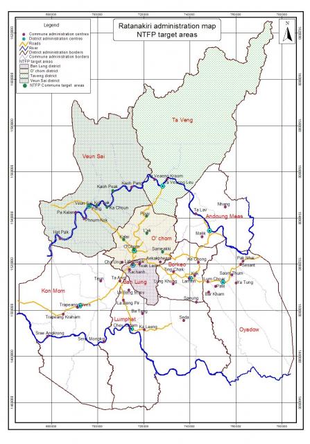 NTFP works with communities in the O Choom and Veun Sai districts. We plan to expand our coverage to include Ta Veng district soon. Please see the map below: